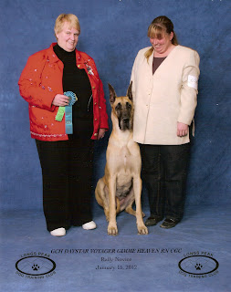 One dog is chosen Best In Show and one dog is chosen Reserve Best in Show. Gimme Ma'am tells me that she has won Best in Show twice, and Reserve Best in Show three times at UKC shows!! Mommy has also had another Great Dane Best in Show winner (Tia) and a Doberman Best in Show winner (Isis). Mr. Fox Sir has multiple Group Placements and Doozer (Mommy's first Saint Bernard) won the Group once. Wow! Lots to live up to!!